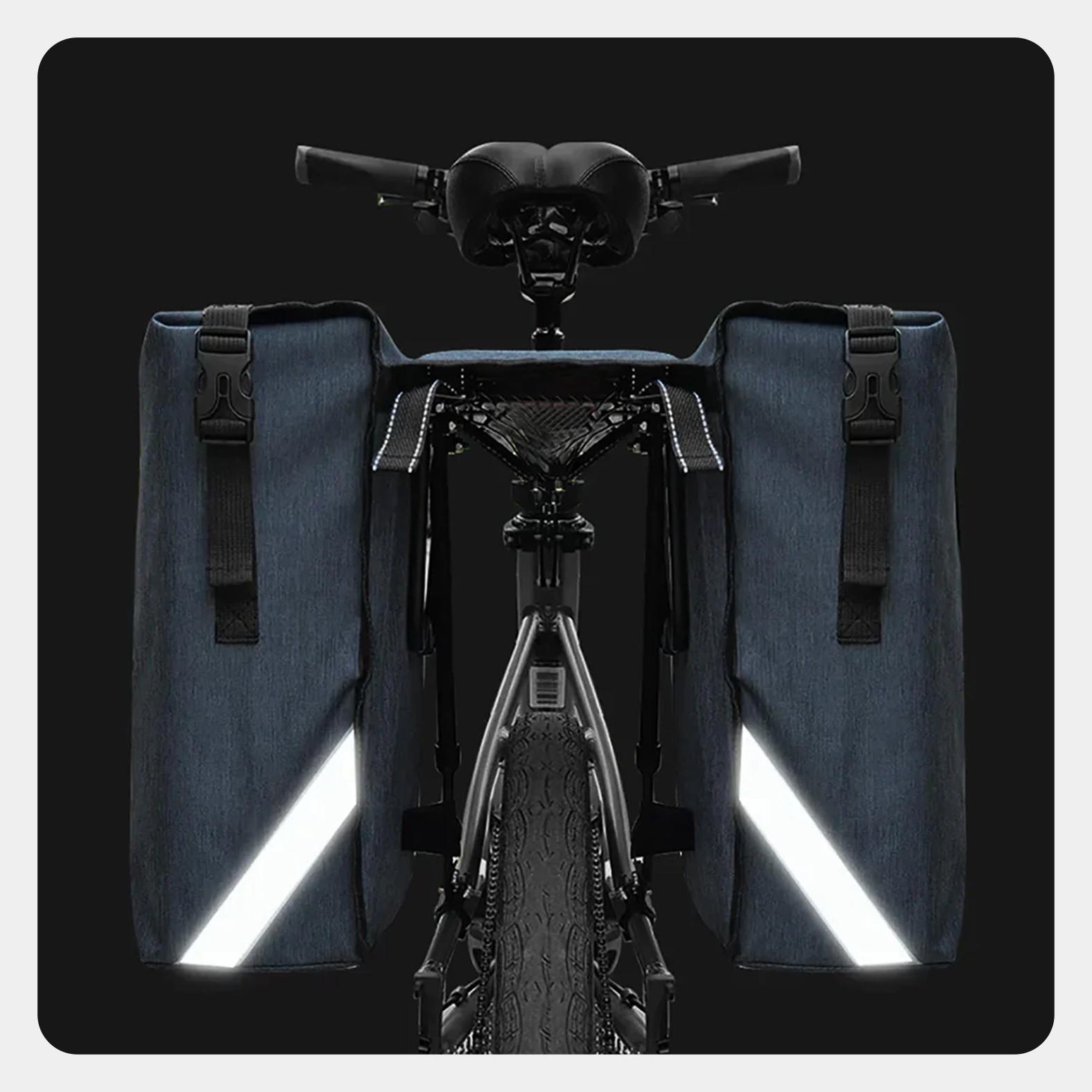 Durable cationic Oxford twin panniers with reflective panels, waterproof zippers, and easy rack mount/removal